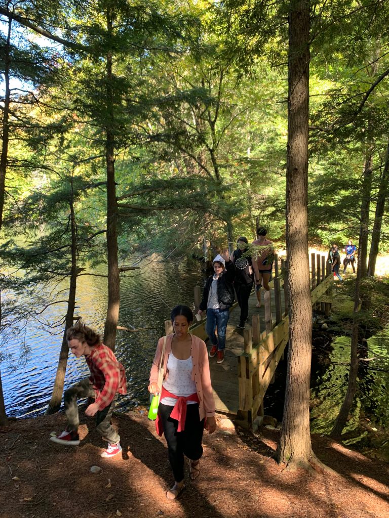 Campers and their advisor walk to the “peninsula” for their final advisee meeting