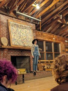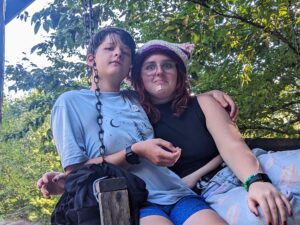 I get my camp shirt during siesta and have so many camp folk sign my shirt immediately, I am often bad about this and am so happy I have been on top of it this year. I go to light stretching and workout, I feel like A STAR! afterwards. I spend a little over an hour in the swining bench on my beloved porch lodge, Phaedrus and Christian swinging me periodically. This is one of the most magical moments I have had at this session so far. I get swept up by the start of dinner, it’s mac n cheese and greenbean casserole! It’s so delicious, I want to cook for myself for the rest of my life. Evening meeting was smooth, I am eager to get my fairygodchild tomorrow from the bowl of names. I am eager to give to someone I do not know. Inbetween evening meeting and the talent show, I am smooshed in a pile of cuddles between ZoeJDP, Beatrice, Saskia, Rowen, Jane, and Phaedrus.