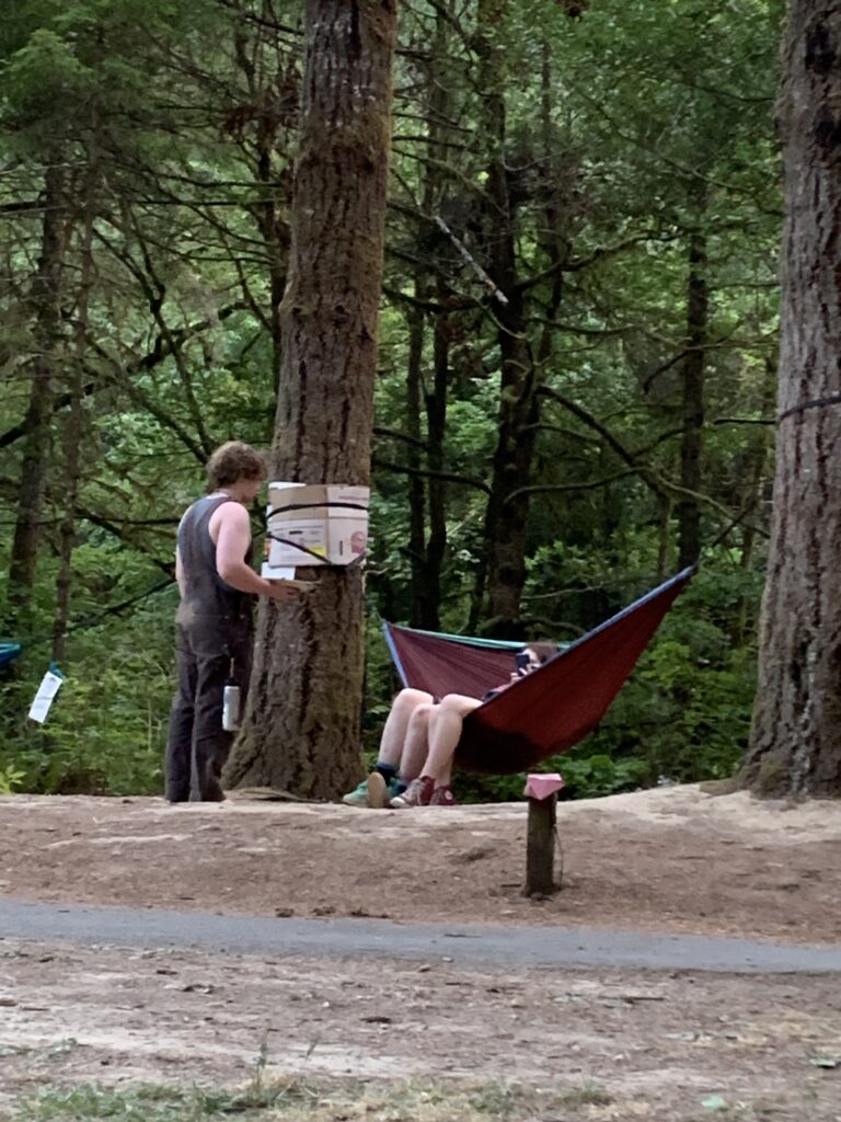 Phaedrus, Lucy, and I decided to lay in the hammock, we were cold so I got my Josh Hutcherson blanket, Lucy read a book and Phaedrus and I laid there. Eventually, in iconic camp spirit, a group of friends ends up around the hummock, we all joke around till dinner.